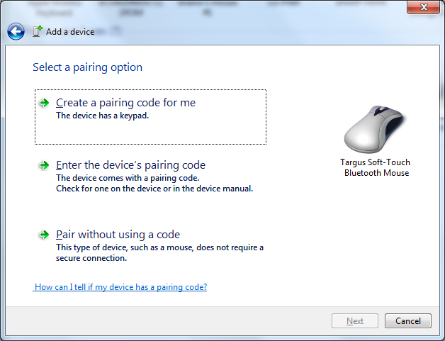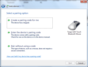 Normally I just go into ‘Devices and Printers’ and delete the device and pair it again. This usually works seamlessly. Today, not so much. I successfully delete the Targus mouse from the ‘Devices and Printers’ and that works correctly. I then put the mouse into discovery mode and start the ‘Add a Bluetooth Device’ panel. The panel finds the mouse fine. I select the mouse and click ‘Next’. I then see the next image.