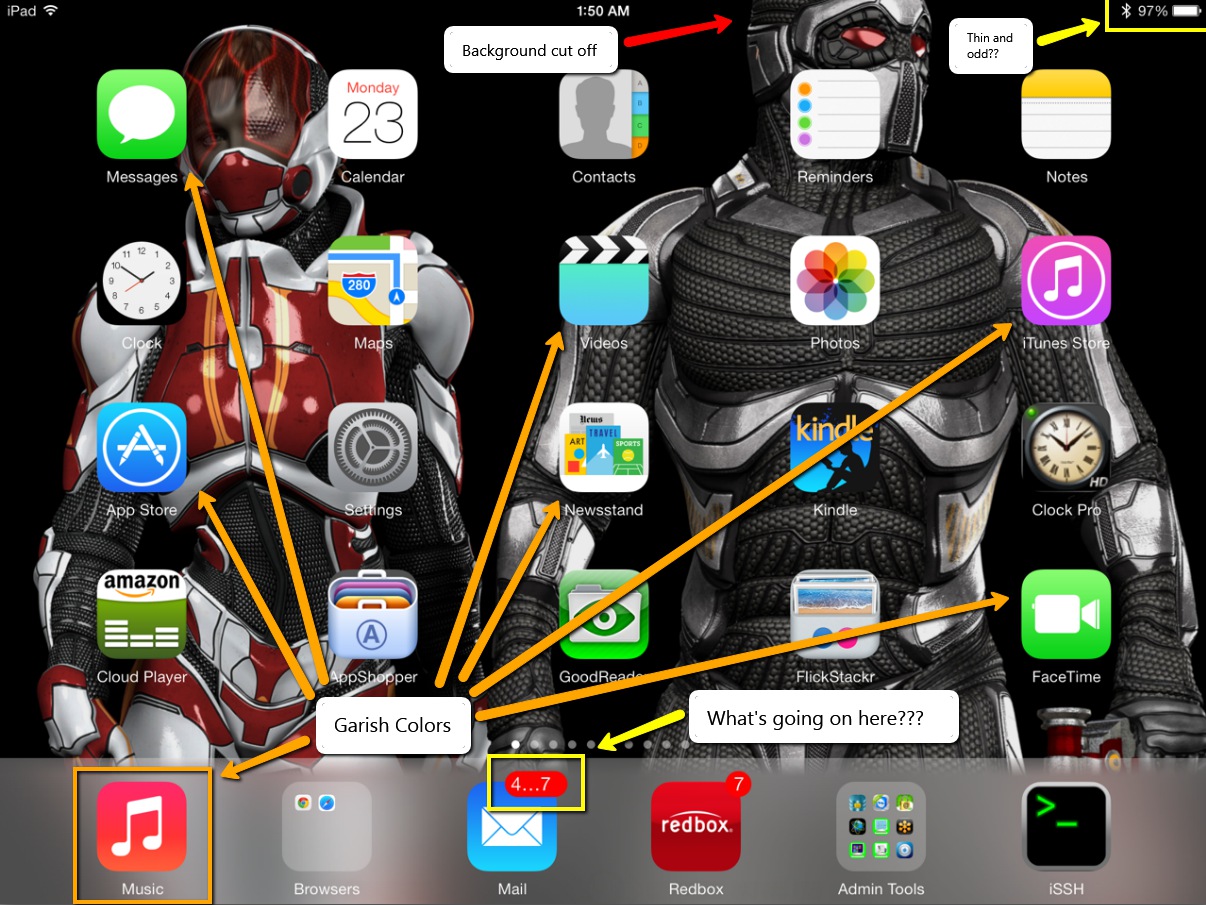 Ok, so when I flipped open my iPad the first time on IOS7, I’m greeted by white screens (or nearly white screens). At first I wasn’t sure to make of it. Now, I’m quite sure. The white screens must go. If you’re trying to use the iPad in the dark, it’s like having a flashlight shining in your face. No, thanks.